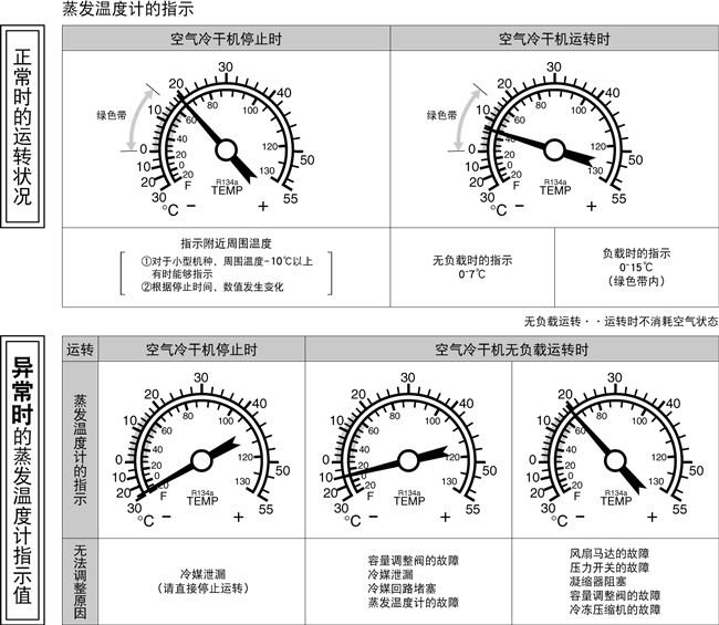 請確認冷干燥機運行時蒸發(fā)溫度計的指示在綠色范圍內。