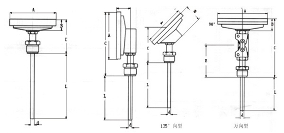 根據雙金屬溫度計指針盤和保護管的連接方向,雙金屬溫度計可分為軸向型、徑向型和135°;有四種類型:方向型和通用型。